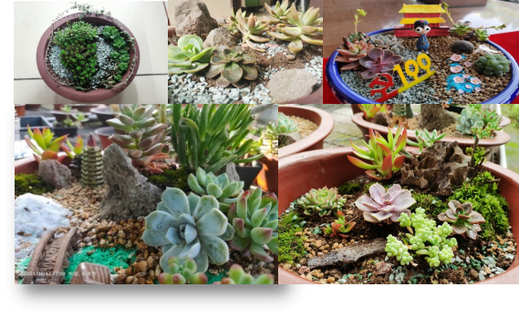 三是“忆史艺心”多肉盆栽微景观设计大赛。“重温党史辉煌,百年初心,历久弥坚。”将党史和多肉植物融合在一起,以植物为引,探寻植物红旅故事。《锦绣之路》使用花形多肉象征花团锦簇,展现了漫漫党史路是崎岖之路、复兴之路,更是锦绣之路。《枯木逢春雨》利用山石、河流、枯木等元素,展现在百年风雨巨变中,中华大地如枯木逢春雨,生机勃勃。《寻路——红军不怕远征难》作品以红色和绿色为主,象征着长征是一段波澜壮阔的岁月,见证了一个伟大民族的新生与崛起。《征途•无私》将植物与手工天安门、红军模型融合,展现红军漫漫长征路,赤诚无私心的信念。《监狱里的小英雄—小萝卜头》将多肉设计为萝卜形状,展现小小萝卜,朴质无华,小小英雄,小而弥坚。《忆百年巨变,绘江山蓝图》以改革开放为主题,以植物绘制国泰民安的江山蓝图。《守护》以2020年6月中印边境冲突为切入点,用植物歌颂英雄用鲜血守护国土,守护人民的决心。《筚路蓝缕建基业,自强不息启青年》利用木桥、假山、红色多肉体现中国共产党建党初期面临的挑战,启示青年担负历史使命,引领新时代。