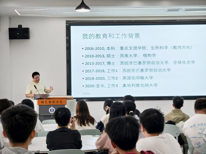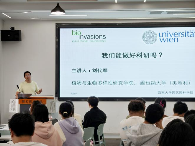为进一步帮助学生树立科研创新意识,营造科研创新良好氛围,10月18日,学院在33教508举办艺林学子经验交流分享活动,本次活动邀请学院2013届校友、奥地利维也纳大学植物和生物多样性研究学院博士后刘代军为同学们分享科研经验,学院党委书记潘玉锋,本科生研究生80余人参与本次活动。活动由学院副院长周建华教授主持。