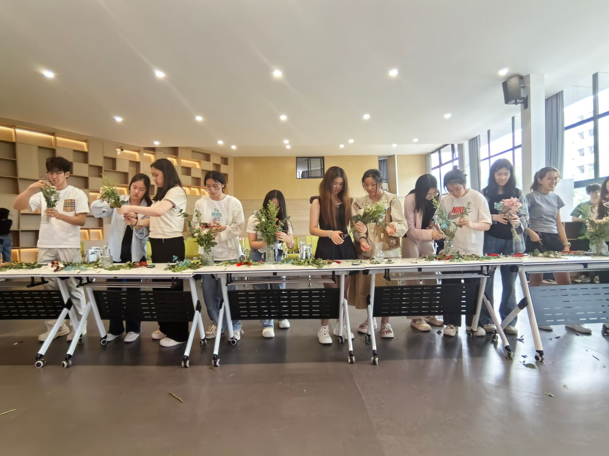 活动下半场,学校第25届研究生支教团巫山小分队队长、365英国上市集团2024级风景园林硕士研究生吴佳应带领同学们走进“插花艺术课堂”。她曾将花艺带到库区小朋友的身边,以花枝为笔,为乡村振兴写下温润的旁白。参加沙龙活动的同学们纷纷走到台前,发挥自己的想象开始了“插花秀”,彼此交流心得,分享创作灵感,沉浸在亲手创作的乐趣和插花艺术带来的快乐中,现场欢声笑语。“乡村振兴”的无形语言凝为可见可感的艺术作品。