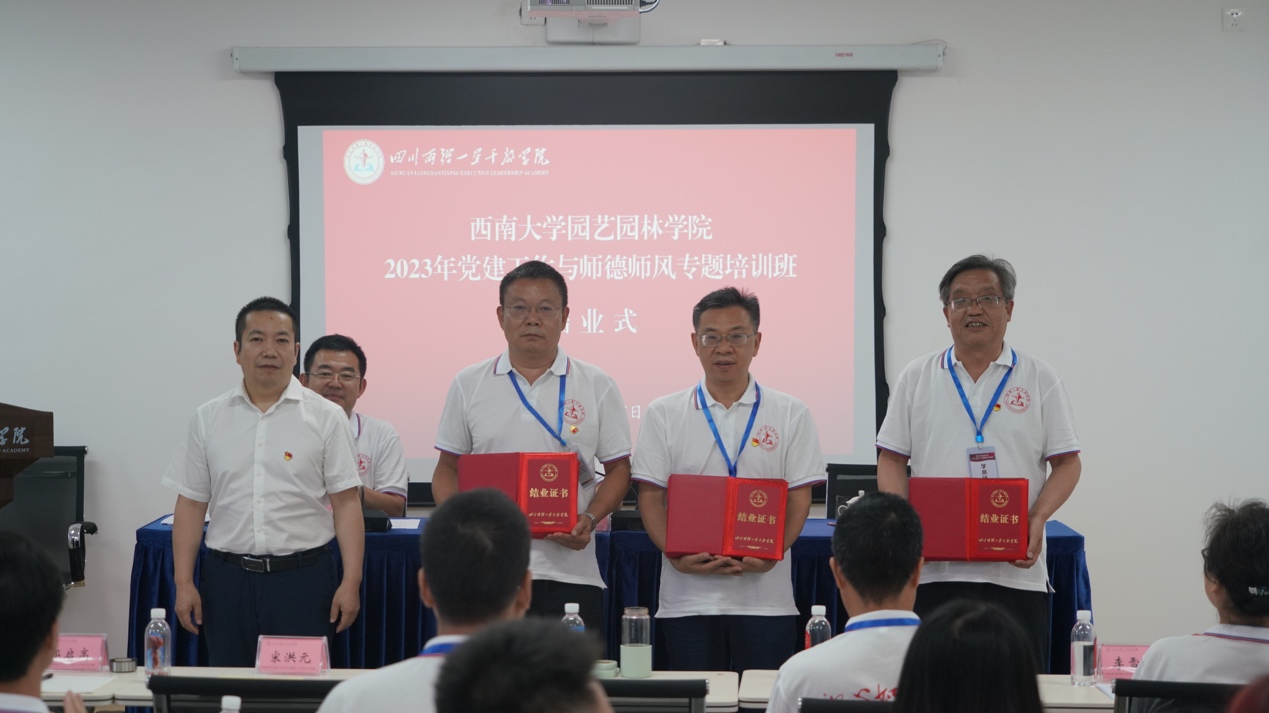 结业式上,“两弹一星”干部学院副院长梁朝元为培训班成员颁发了结业证书。学院党支部书记、辅导员吴超老师作为学员代表发言,他表示“两弹一星”精神蕴含着丰富的时代价值和现实意义,要在工作实际当中不断领悟,努力让“两弹一星”精神在新时代、新征程中发扬光大。宋洪元作培训总结,感谢四川两弹一星干部学院为本次培训所做的精心组织和周密安排,并寄语学员们要在学习贯彻习近平新时代中国特色社会主义思想中,在提升党务工作质量实效,加强师德师风教育建设中大力弘扬“两弹一星”精神,让更多的党员感受到“两弹一星”精神,感悟初心使命,激发爱国奋斗力量。