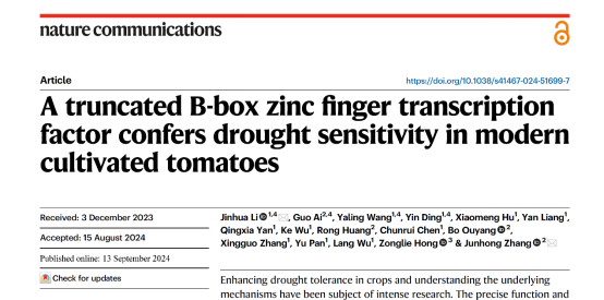 学院园艺植物发育与逆境生物学创新实验室李金华教授团队联合华中农业大学张俊红教授团队于9月13日在国际知名期刊《Nature Communications》上在线发表了题为“A truncated B-box zinc finger transcription factor confers drought sensitivity in modern cultivated tomatoes”的研究论文。该论文从番茄种质(醋栗PIM,樱桃CER和大番茄BIG)进化上发现了一个抗旱相关的重要SNP,该SNP会导致一个B-box锌指转录因子BBX18的提前终止并影响基因的转录活性。通过调查321份番茄种质资源核苷酸的多样性,发现在该SNP突变在番茄进化过程中是自然突变形成的。不同种番茄资源进行耐旱性分析,发现番茄的抗旱性是和该SNP的突变类型是密切相关的。