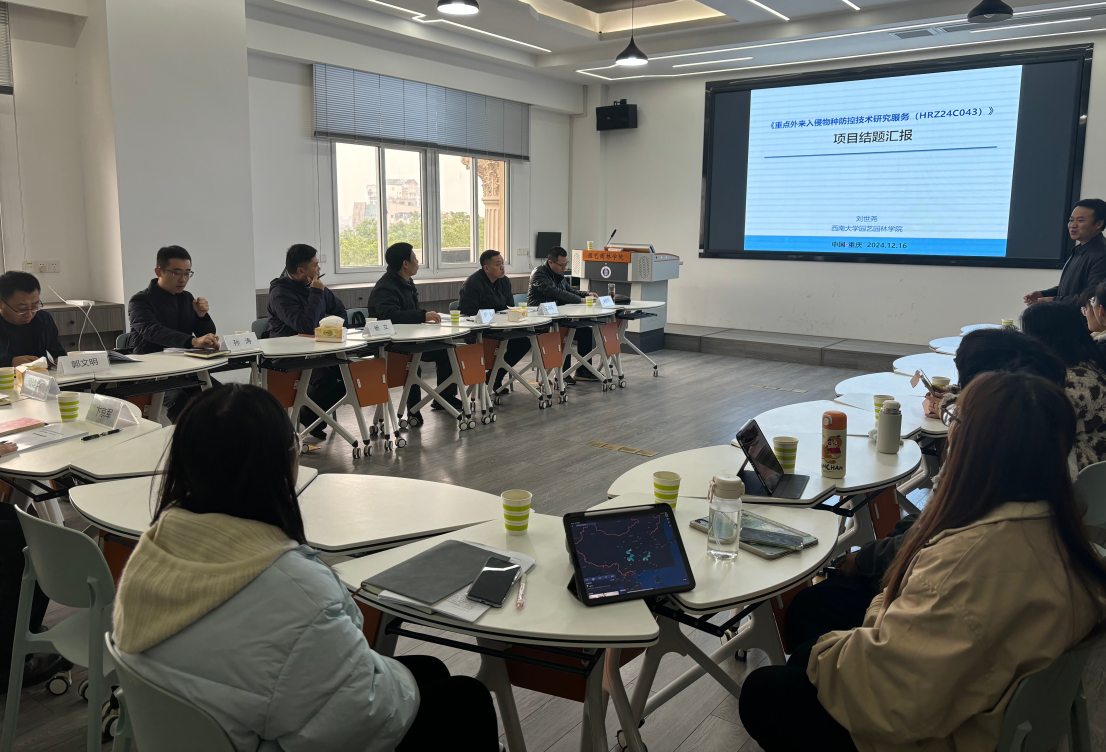 会上,刘世尧作为项目主持人代表研究团队对项目背景、合同任务与完成情况、工作成效、下一步工作计划进行了全面汇报,内容包括对重庆市鬼针草属六种常见物种的形态学、脉纹图谱与TLC快速鉴定研究、苗期低毒高效除草剂筛选与花期物理防治技术研究、六个物种活性成分代谢组广靶鉴定研究的结果,为重庆市鬼针草属入侵植物的苗期防治与果前利用提供了具体路径,植物学系刘小刚和江广渝两位老师共同参与了相关研究工作。与会专家对项目所取得的成果均表示肯定,并建议将鬼针草属入侵物种鉴定深入到基因层面、进一步凝炼防治灭除方法,继续深入推进鬼针草属资源化利用研究。重庆市农业农村委生态处罗松处长在总结时高度赞扬项目团队的工作质量与成效,认为项目研究为维护重庆生态安全和农业可持续发展提供了技术保障,希望项目研究能进一步深化,并建议相关部门加强对项目研究成果的推广和应用。