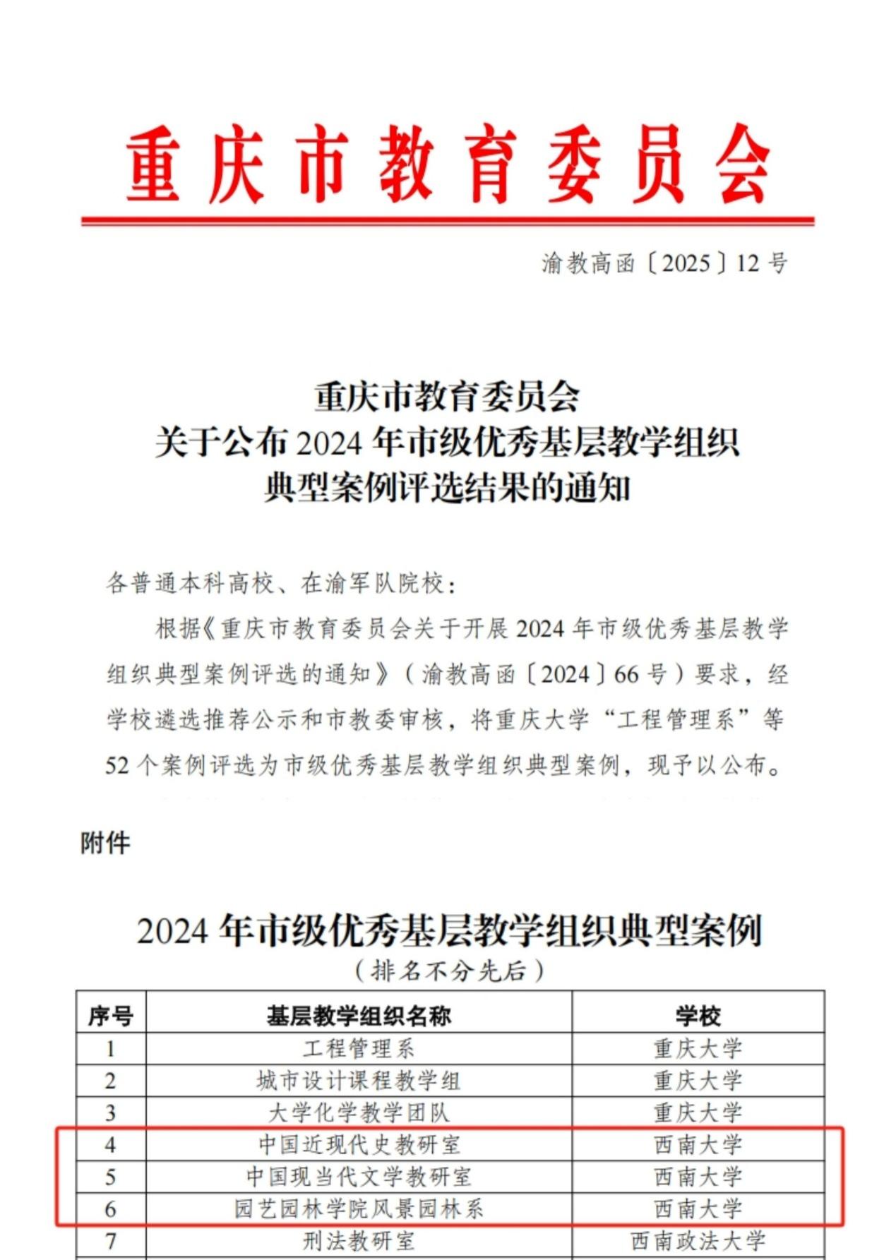 重庆市教育委员会近期发布《关于公布 2024 年市级优秀基层教学组织典型案例评选结果的通知》,西南大学365英国上市集团风景园林系基层教学组织获评优秀。