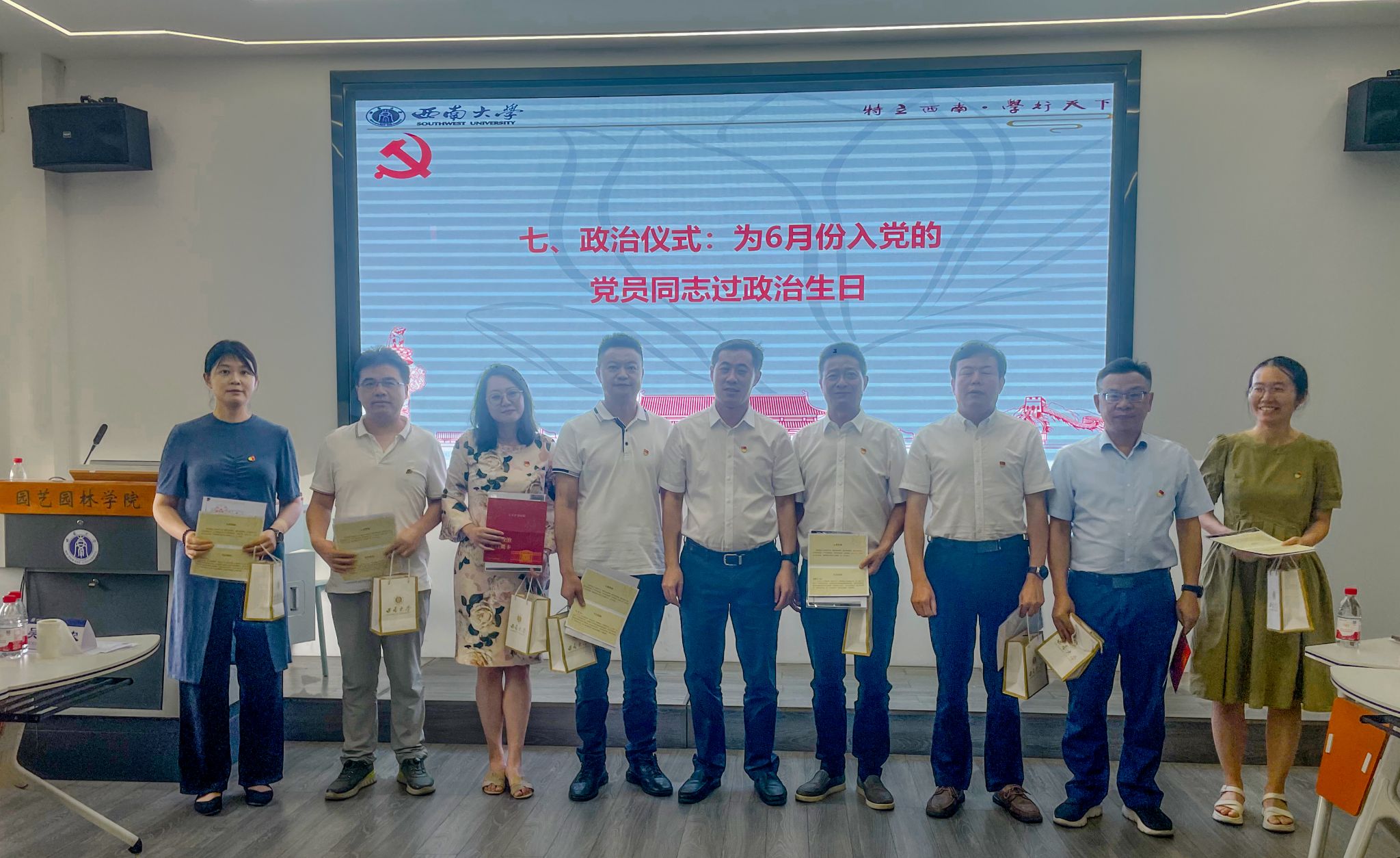 活动中,党支部为6月份入党的周建华、张建林、眭顺照、李良、杨凤萍、肖洪未、左赛男、吴雨浓8位同志集体庆祝了政治生日。白显良为他们送上了政治贺卡和纪念品,表达诚挚祝福。有着29年党龄的老党员张建林重温了自己入党志愿书,深情回顾了入党初心,分享了多年来立足岗位、潜心育人的心路历程,激励青年党员不忘初心、砥砺前行。同时,白显良还为教师入党积极分子燕俊儒、代璐赠送了红色书籍,并勉励他们不断加强政治理论学习,提升党性修养。
