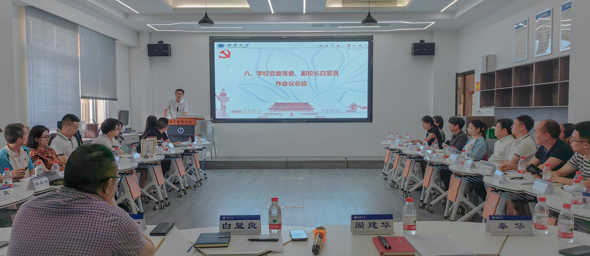 6月13日,学院绿色人居教师党支部在33教508室举行了6月组织生活。学校党委常委、副校长白显良出席并指导,学院党委书记周建华,党委委员、副院长郭启高,风景园林系主任杜文武、副主任罗爱军,以及支部全体党员、教师入党积极分子共同参加了本次活动。主题党日由党支部副书记吴雨浓主持。