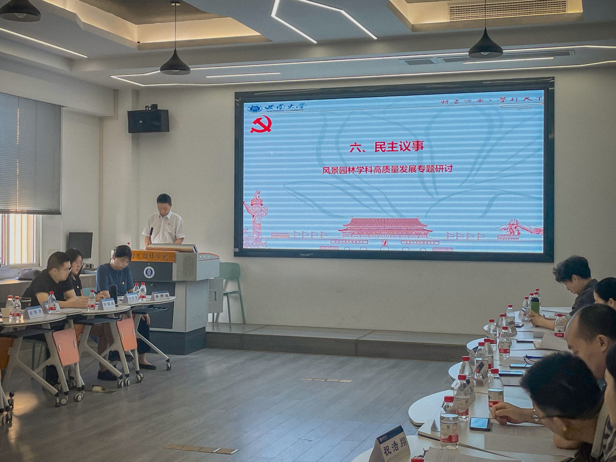 在民主议事环节,学院党委书记周建华,风景园林系主任杜文武,风景园林系副主任罗爱军聚焦风景园林学科高质量发展问题,分别以 “第十四届中国风景园林教育大会暨2025年全国风景园林专业学位研究生教育年会筹备情况”“坚持立德树人构建高质量博士培养体系”“党建引领专业发展:新专业与微专业的探索与实践”为主题进行了发言,聚焦学科建设与人才培养关键问题,提出具体思路与举措。秦华、马婧、孙松林三位同志围绕“新专业建设中存在的困难”“学科高质量发展解决方案”“如何加强师资队伍建设以提升教学质量”等方面展开热烈讨论,现场气氛活跃,思想碰撞充分。