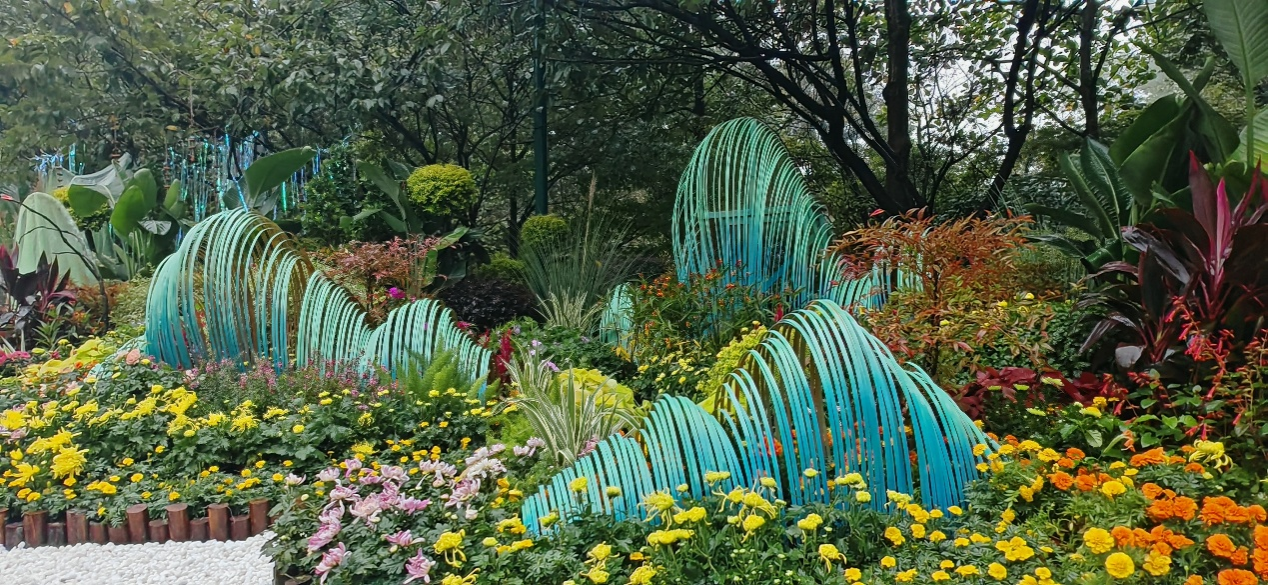作品介绍:作品捕捉一抹山城的神韵,以质朴的“竹编”艺术,勾勒出起伏连绵的山形轮廓。竹编的经纬之间,是山峦的呼吸与骨骼,其挺拔向上、虚实相生,在光影中化为空间的视觉焦点与精神图腾。植物是这片天地的血肉与情感。菊花以其凌霜绽放的风骨,与竹编山体所蕴含的坚韧力量,共同诠释着向上生长的生命意志。周围郁郁葱葱的乔木与灌木,进一步烘托出巴渝山地的自然生机。
