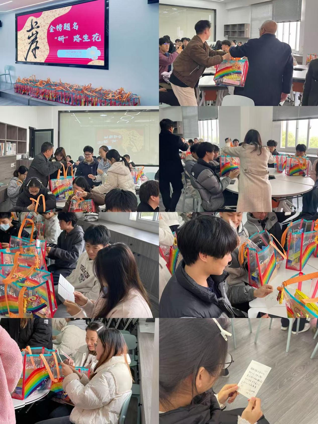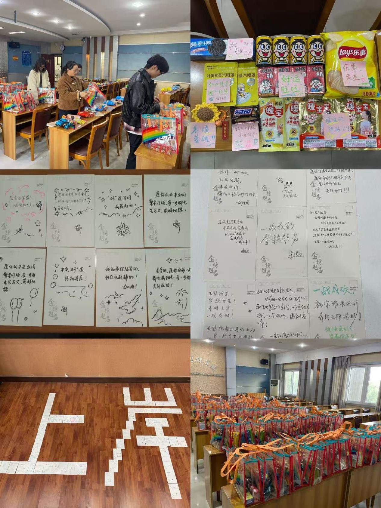 活动伊始,现场洋溢着温馨暖心的氛围。学院精心准备的“考研暖心大礼包”整齐摆放,每一份都蕴藏美好寓意:“好运旺旺”“乐事发生”“养‘晴’蓄锐”“巧克难题”......礼包中还附有学院领导、老师和同学们亲笔书写的明信片,字里行间满载对考研学子的深情鼓励与殷切期盼。