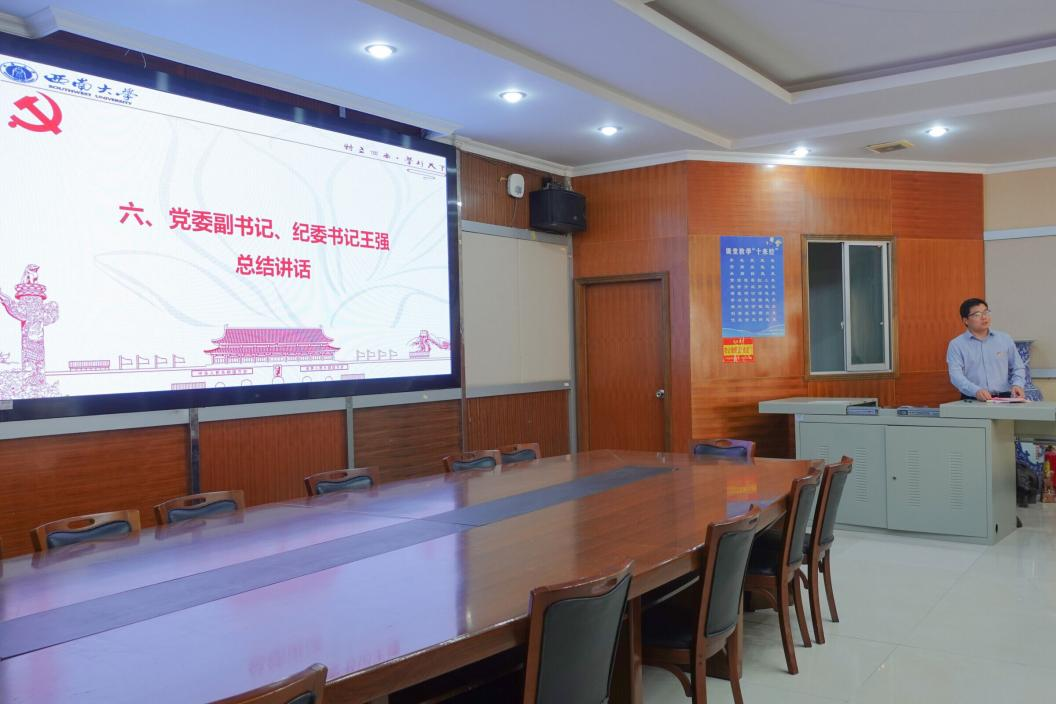 王强作总结讲话。他表示,本次主题党日观摩活动准备充分,内容丰富,形式多样,环节紧凑,充分发挥了样板党支部的示范引领作用,为学生党支部主题党日活动的开展提供了一个很好的示范。他强调,当代大学生定要厚植对党的赤诚热爱、对国家的家国情怀、对社会的责任使命,践行有担当的时代要求,锤炼能吃苦的坚韧品格,弘扬肯奋斗的光荣传统,以实际行动展现青春作为、彰显青春风采、书写青年篇章。