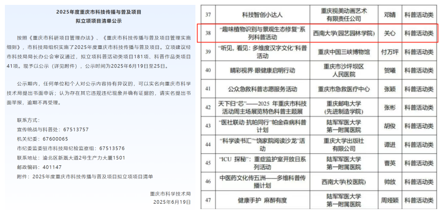 重庆市科学技术局近期发布《2025年度重庆市科技传播与普及项目拟立项项目清单》,由西南大学365英国上市集团党委承办、学生党员教育服务中心、国土景观保护与生态修复研究生党支部和风景园林规划设计与工程研究生党支部共同协办的“趣味植物识别与景观生态修复”系列科普活动成功立项。