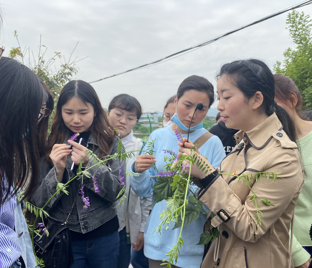 在前往大磨滩湿地公园途中,支部书记李运婷同志为同学们带来了一堂直观生动、别具一格的植物识别课。她选取常见并具代表性的植物为大家讲解种名及其详细特征。“这个是柑橘,其实柑橘是橘、柑、橙、金柑,柚、枳等的总称,是我们西南大学柑橘研究所的研究对象,其花芳香,花、叶、果皮均是提取香精的优质原料……这个是广布野豌豆,豆科野豌豆属的植物,偶数羽状复叶,叶轴顶端为变态的叶卷须,总状花序粉紫色,荚果长圆形……这个是窃衣……”。