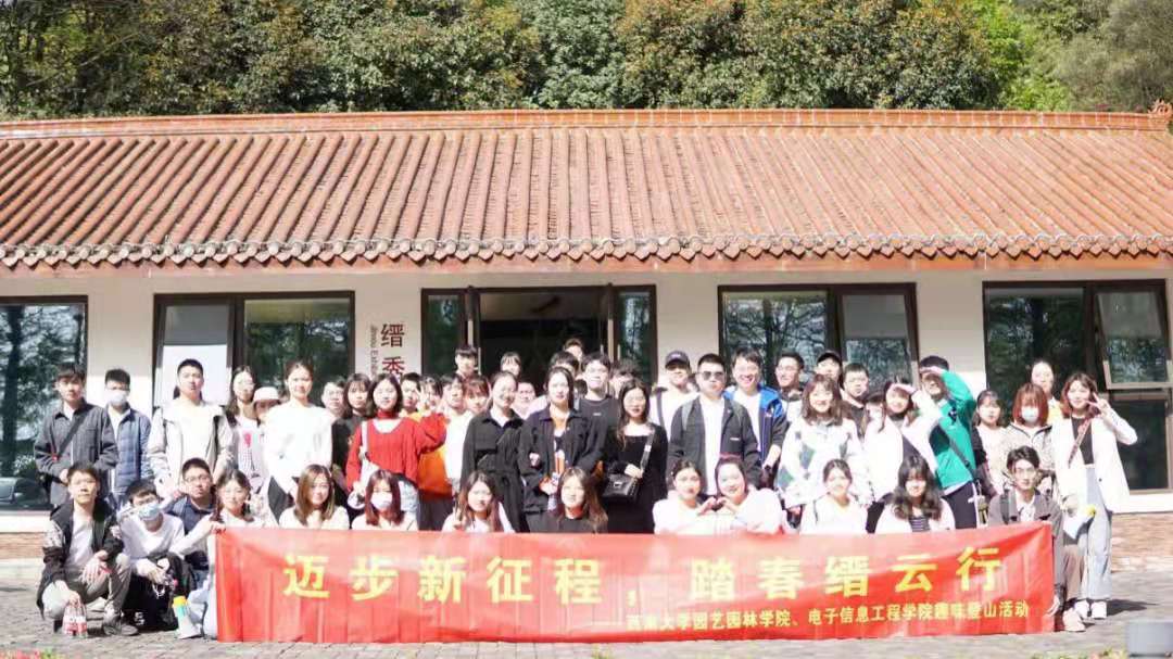 为弘扬西南大学优良传统,为建党100周年献礼,并丰富研究生的课余生活,提高身体素质,营造积极、健康、快乐、向上的校园文化氛围。2021年3月28日,我院与电子信息工程学院联合举办了“迈步新征程,缙云踏春行”登山活动,两院研究生通过勇攀缙云,用行动表达对祖国的热爱,用热情和活力展示学院的底蕴风采。