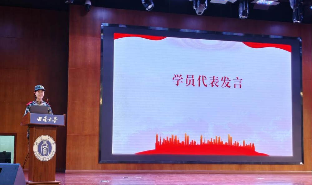 承训部队教官罗森对学院2024级本科生顺利完成军训课程表示祝贺,对新生在军训中表现出的坚韧不拔、勇于挑战自我的精神给予了高度评价,希望同学们将军训中培养的优秀习惯、良好作风带入今后的学习生活中,树立报效祖国的远大理想。随后,2024级本科生学员代表邬静发言,她代表全体参训学员对学院领导老师在军训期间的关怀表示衷心感谢,对教官们的耐心教导表达崇高敬意,并表示未来将永葆坚强意志,加强品德修养,刻苦钻研学习,将军训培养的良好作息和习惯保持下去,养成积极向上的生活态度和健康的生活方式,努力成为德智体美劳全面发展的时代新人,为社会贡献力量,为祖国的发展添砖加瓦。