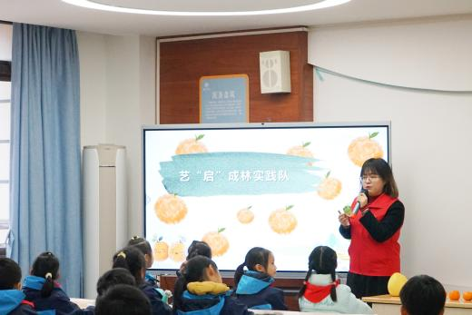 活动伊始,实践队成员尹杰依托园艺专业知识,带领学生们进入有趣的植物生长知识课堂。尹杰以“橘子家族”的常见柑橘类水果为例,介绍了植物果实的多样性特征,并详细讲解了橘子树从种子萌发到开花结果的全过程、植物生长的关键环境条件及病虫害防治方法,帮助学生全面了解植物生长的基本需求和生存挑战。科学性与趣味性结合的知识讲解,让学生们在轻松的氛围中学习了植物生长知识,激发了他们探索自然的兴趣。