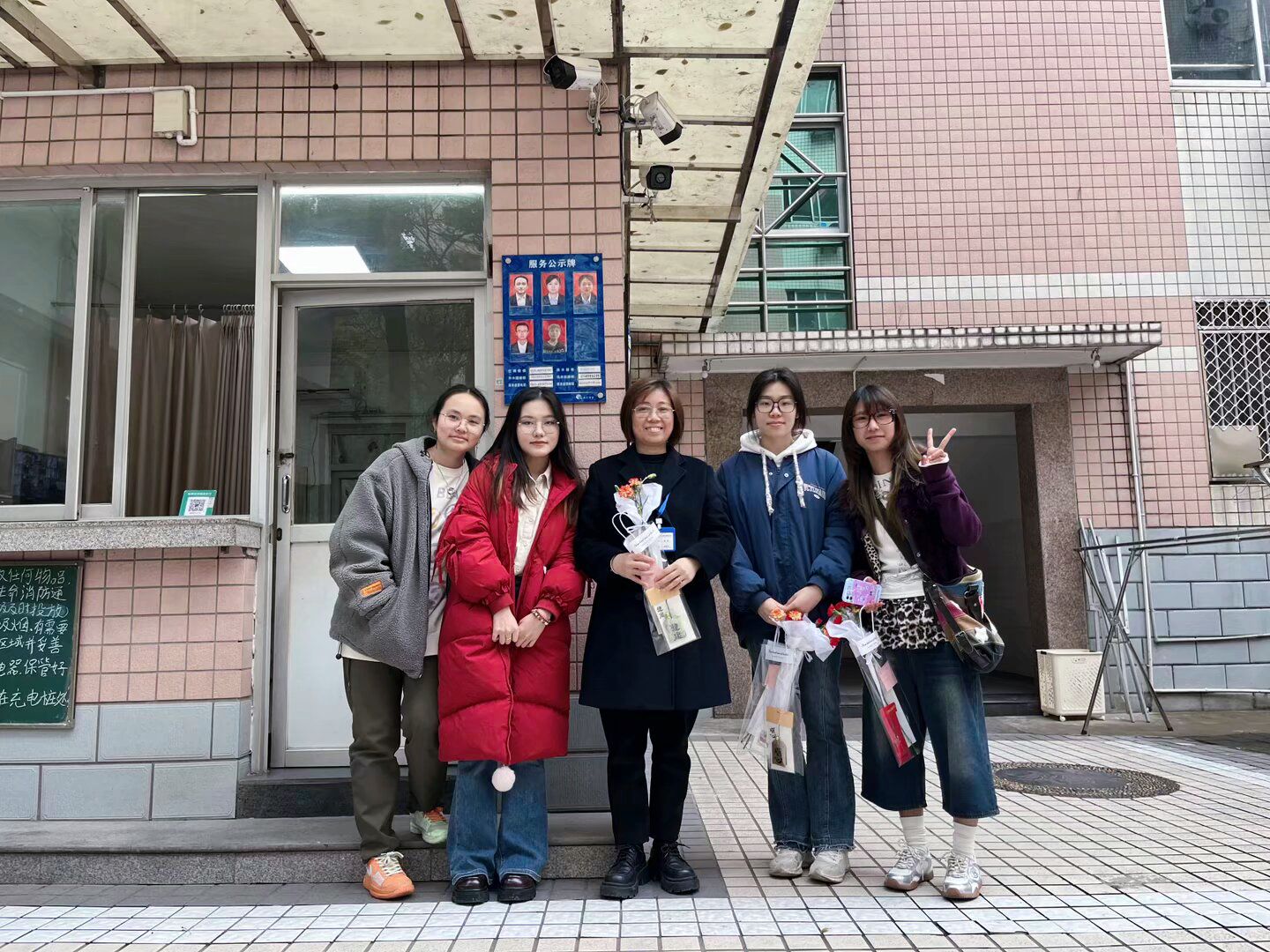 随后,同学们分组前往食堂、宿舍楼、教学办公楼和共青团花园,开启了一场温馨的“献花之旅”。在食堂后厨,同学们将精心准备的鲜花和小礼物递到正在忙碌的阿姨们手中。一位阿姨停下手中的工作,轻轻擦拭着双手,小心翼翼地接过鲜花和礼物。她的眼眶微微泛红,声音中带着感动,“没想到孩子们这么用心,这份礼物让我觉得所有的辛苦都值得了!”