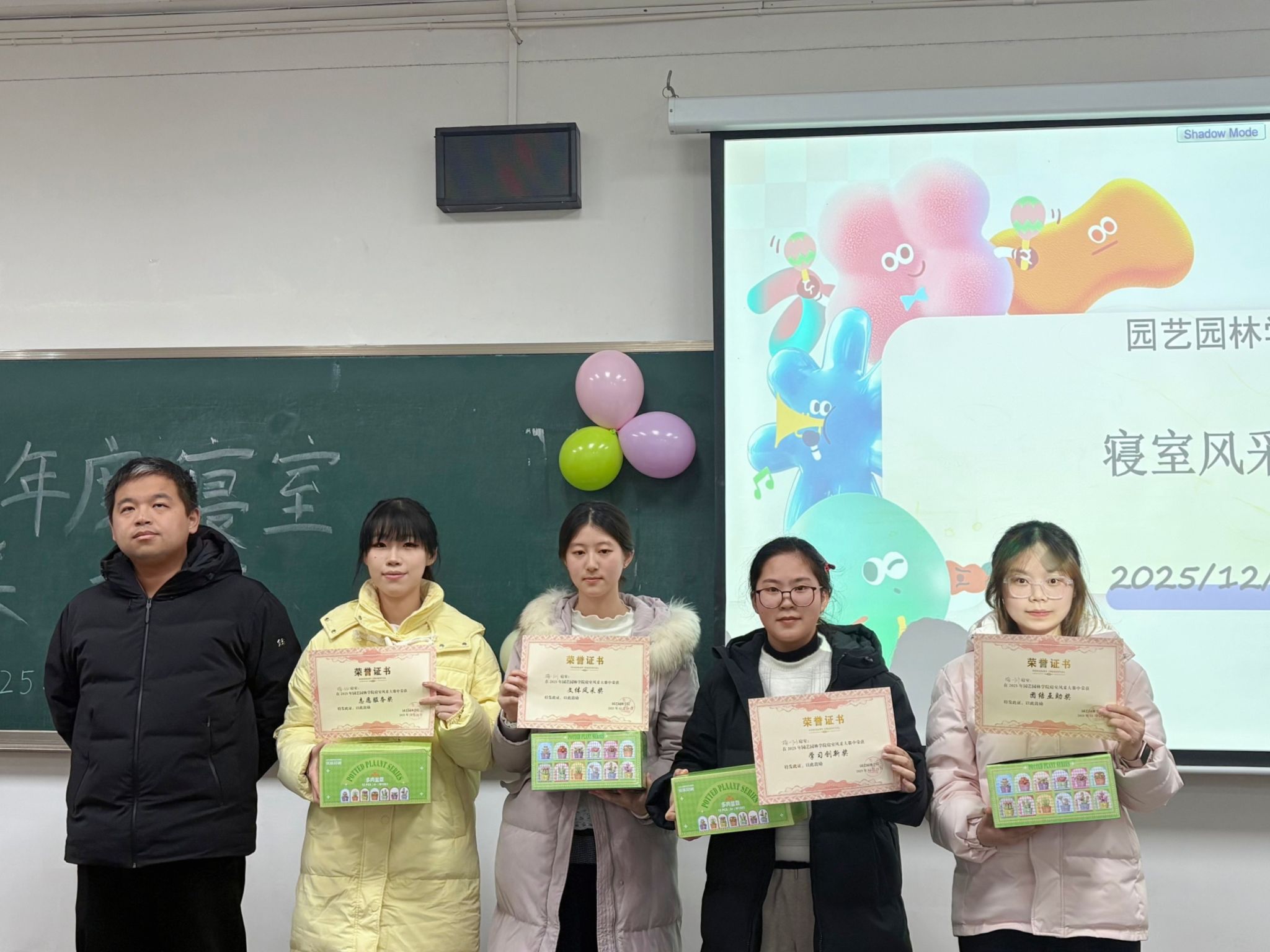 经过展示评比打分,楠园九舍407宿舍荣获一等奖;楠园一舍523宿舍、楠园一舍516宿舍荣获二等奖;楠园一舍705宿舍、楠园一舍503宿舍、楠园一舍415宿舍荣获三等奖;楠园一舍530宿舍荣获志愿服务奖;楠园一舍709宿舍荣获团结互助奖;楠园一舍521宿舍荣获文体风采奖;楠园一舍703宿舍荣获学习创新奖。