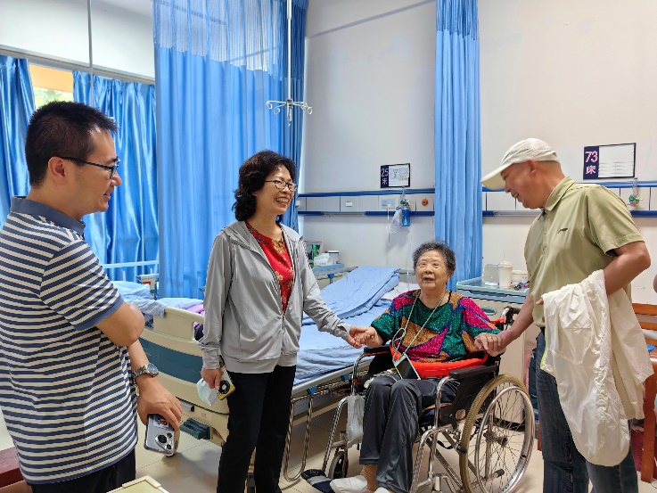 上午11时许,慰问组一行首先来到成都市第八人民医院,看望在此疗养的学院原党委书记岳仲彬。现年88岁的岳老曾于1984至1998年担任学院党委书记,为学院高质量发展奠定坚实基础。在温馨的病房中,周建华书记详细汇报了学院在学科建设、人才培养等方面取得的新突破,唐荣发、李雪梅则与岳仲彬老书记共同追忆往昔奋斗岁月。当听到学院在“十四五”期间取得的巨大成就后,岳老眼含欣慰,连声称赞:"这些年学院发展步子越迈越稳,我们这些老同志看着真高兴!"临别之际,慰问组关切询问岳老的饮食起居和康复情况,并叮嘱医护人员多加照拂。