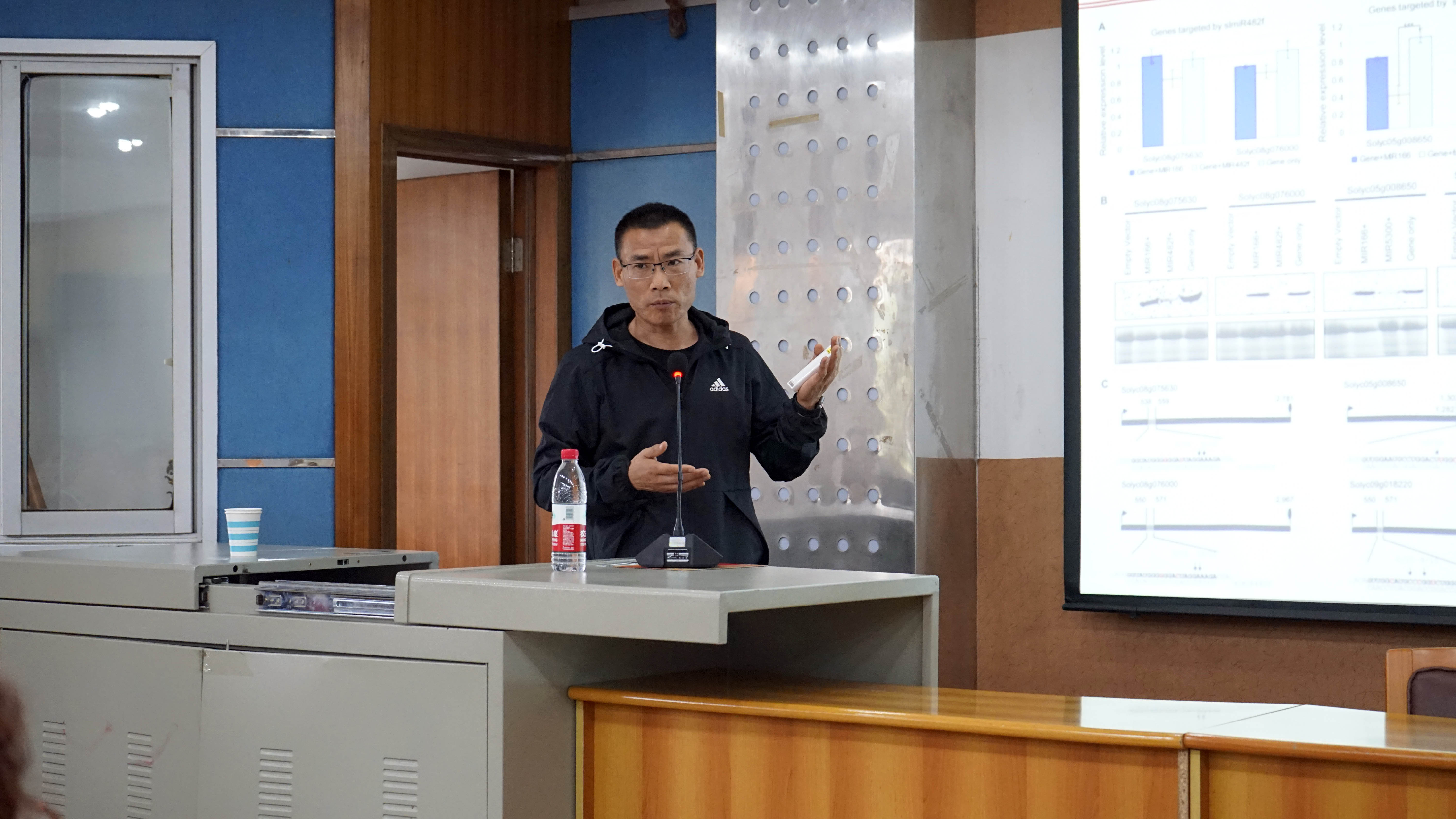 讲座伊始,欧阳寿强教授分享其团队的主要研究方向是 Small RNA在植物-病原菌互作中的功能与机理。欧阳寿强教授以番茄枯萎病为案例,详细介绍团队从发现问题、提出猜想到得出结论的整个实验流程。通过系列生物学信息分析和功能验证,得出结论:MicroRNAs对基因表达具有一定的调控作用。期间,欧阳教授引出一个调控模型,并通过对两个具有相似遗传背景的番茄植株所进行实验的探索,进一步证明了病原菌FolmiR1(Fol-microRNA-like RNA1)跨界进入寄主番茄细胞后,负调控番茄中与抗病相关靶基因的Small RNA这一结论。
