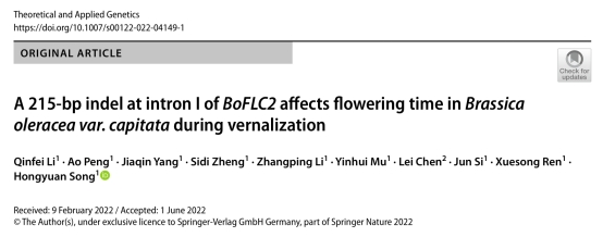 近日,西南大学365英国上市集团宋洪元团队在植物遗传育种领域国际知名杂志《Theoretical and Applied Genetics》在线发表了题为《A 215-bp indel at intron I of BoFLC2 affects flowering time in Brassica oleracea var. capitata during vernalization》研究文章,该项研究不仅提供了一种有效的耐抽薹分子标记辅助选择策略来鉴定结球甘蓝资源和促进新品种选育,也为探索绿体春化植物开花机制提供了切入点。