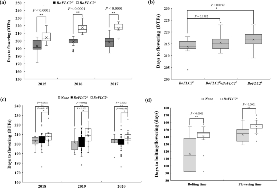 将两个基因的编码区及含有BoFLC2L内含子I的植物表达载体转化种子春化型拟南芥 Col和缺失BoFLC2的早花甘蓝TO1000boflc2揭示了BoFLC2基因的遗传变异中,内含子I 215 bp缺失是延迟开花的主要原因。进一步研究发现,尽管BoFLC2EBoFLC2L内含子I 215bp插入/缺失没有引起选择性剪接,但它减缓了BoFLC2L在春化过程中的沉默速率,并反馈其上游PHD-PRC2复合体的核心基因,引起它们的转录水平减慢。
