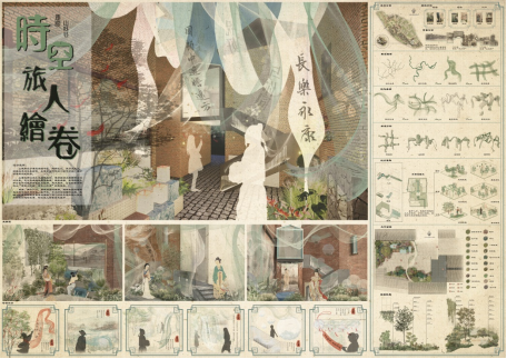 设计理念:山城巷位于重庆市渝中区,毗邻长江,其历史悠久。该场地名为长乐坊院,水平可操作空间10余平方米,属于四周封闭式院落。从重庆两江交汇处提取线形,进而推演出飘带作为设计元素。充分考虑场地整体基调,选择清雅、素净的绿色和白色作为植物搭配的主色调,再点缀青、白色的飘带营造出“苔痕上阶绿,草色入帘青”的意境美。再者,两个入口、两种材质的楼梯、两种类型的墙体成为场地的矛盾所在。基于此,引出时空碰撞的主题,再融入山城巷历史背景进而描绘了两个时空失意的旅人在长乐坊院相遇的故事,时空旅人绘卷由此展开......