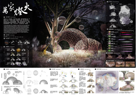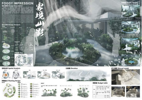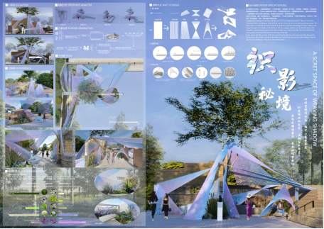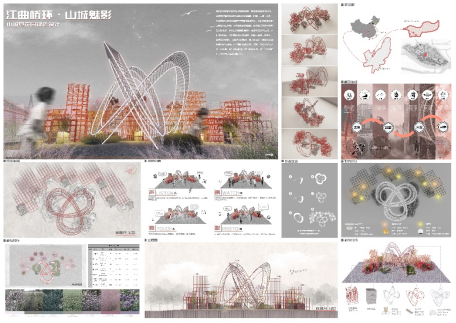设计理念:对重庆的特色文化的思考是我们本次设计的缘起,围绕着城中山巷寻芳菲这一主题,我们对重庆的江水、桥梁、别具特色的街巷风貌进行解构重组,并最终设计出了以江曲桥环· 山城魅影为题的花园空间,以建造的方式来讲述山城故事,唤醒情感共鸣。花园空间的主体灵感来自于嘉陵江千厮门大桥,配景是一组高低错落的方格网架,勾勒出迷雾下的山城轮廓。通过灯光设计,勾勒独属于重庆的夜之绚烂;用风铃的悦耳声响,模拟江水涛涛之声;重庆独有的气候孕育多种灿漫的花卉植物,将花同构造相结合,呈现出别样的花卉之美。我们希望通过本设计,实现形与色的碰撞,声与影的结合,展现山城巷独特魅力,与观者共赴沉浸式文化体验之约。