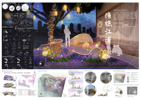 设计理念:《华阳国志·巴志》中结舫水居五百余家一言道出重庆深厚的码头文化,江滩樯桅如林、船蓬相连,处处可见渔民捕鱼之景。本设计以渔樵江渚为主题,以重庆码头文化为切入点,挖掘承载其深厚历史文化的要素江水渔网船篙,抽象三要素形态,通过构筑和植物营造泛舟览江银鳞雀跃结网归舟的场景序列,形成舒缓、跳跃、明快的节奏变化,艺术化展现老重庆码头捕鱼的生活场景,并结合夜晚灯光设计,营造字水霄灯的景象,带领观者浸入古老重庆江滩的浩浩江水,重忆往昔。