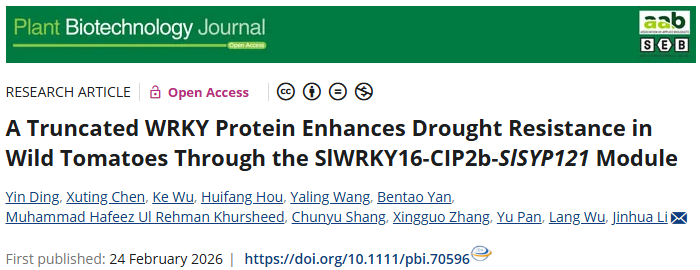 学院园艺植物发育与逆境生物学创新实验室李金华教授团队于2月24日在Plant Biotechnology Journal杂志在线发表了题为“A Truncated WRKY Protein Enhances Drought Resistance in Wild Tomatoes Through the SlWRKY16-CIP2b-SlSYP121Module”的研究论文,揭示了SlWRKY16–CIP2b–SlSYP121调控模块介导番茄抗旱性的分子机制。