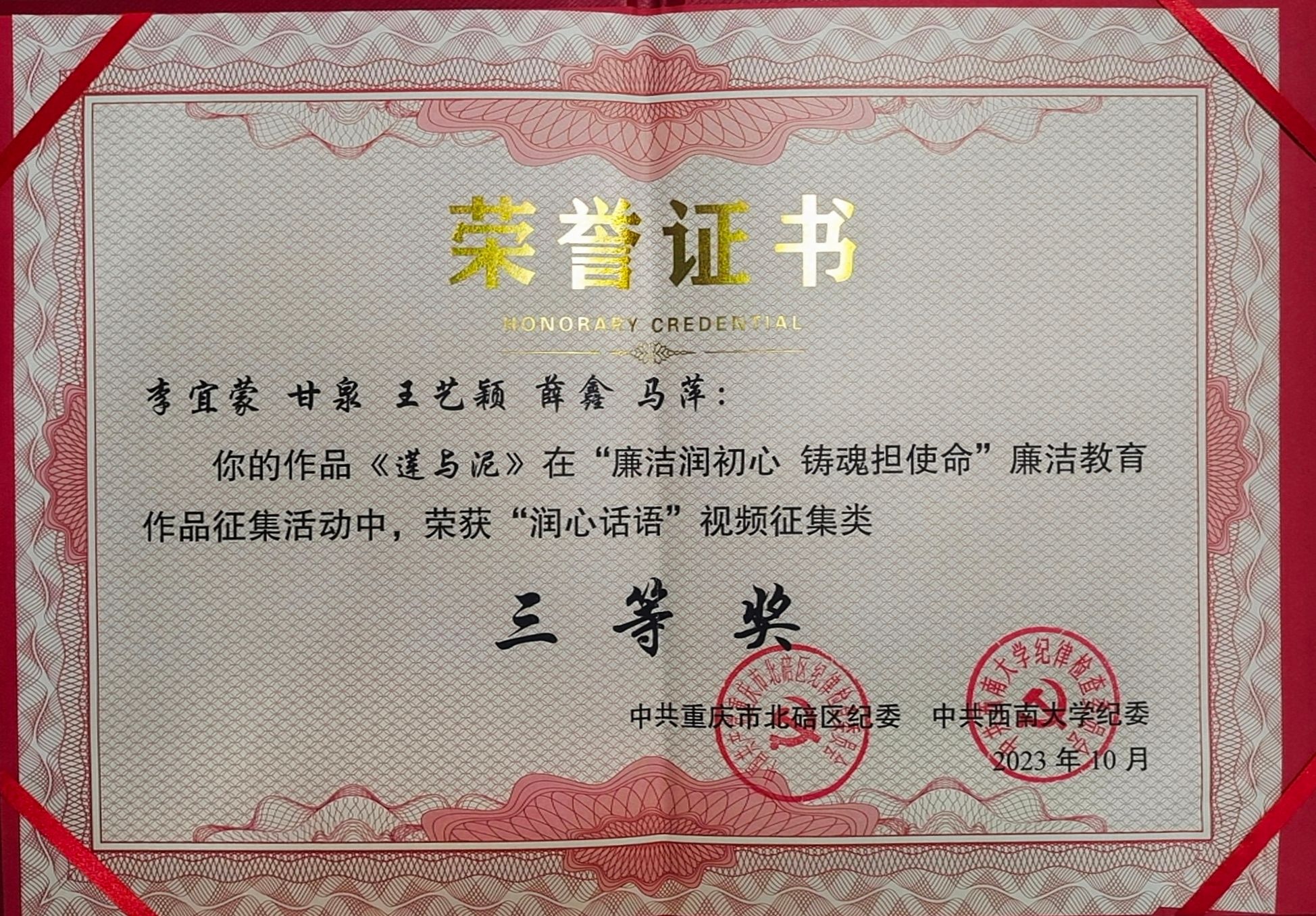 为深入学习贯彻党的二十大精神,贯彻落实党中央《关于加强新时代廉洁文化建设的意见》要求,围绕落实立德树人根本任务,纵深推进全面从严治党,重庆市北碚区纪委监委、西南大学纪委组织开展了“廉洁润初心 铸魂担使命”廉洁教育作品征集活动。征集活动开展以来,学院纪委高度重视,鼓励师生开展形式多样的廉洁文化创作活动,并选送优秀作品参加征集。最终,周嘉馨作品《洁若清莲,廉于青年》获得“廉心文语”校园征文类二等奖,李宜蒙、甘泉、王艺颖、薛鑫、马萍作品《莲与泥》获得“润心话语”视频征集类三等奖。