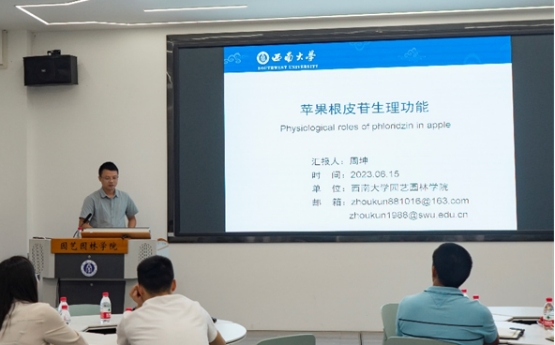 本期学术沙龙的报告嘉宾为周坤副教授。周坤副教授以“苹果根皮苷生理功能”为题,系统的阐述了苹果特征性多酚—根皮苷在苹果生长发育和逆境抵御过程中的重要作用。此外,还和大家分享了取得优秀科研成果背后的故事,精彩幽默的分享给了与会人员很大的启发。在学术交流阶段,周坤副教授和与会师生就科研选题切入、面对科研困境的解决方法进行了深入的探讨交流。